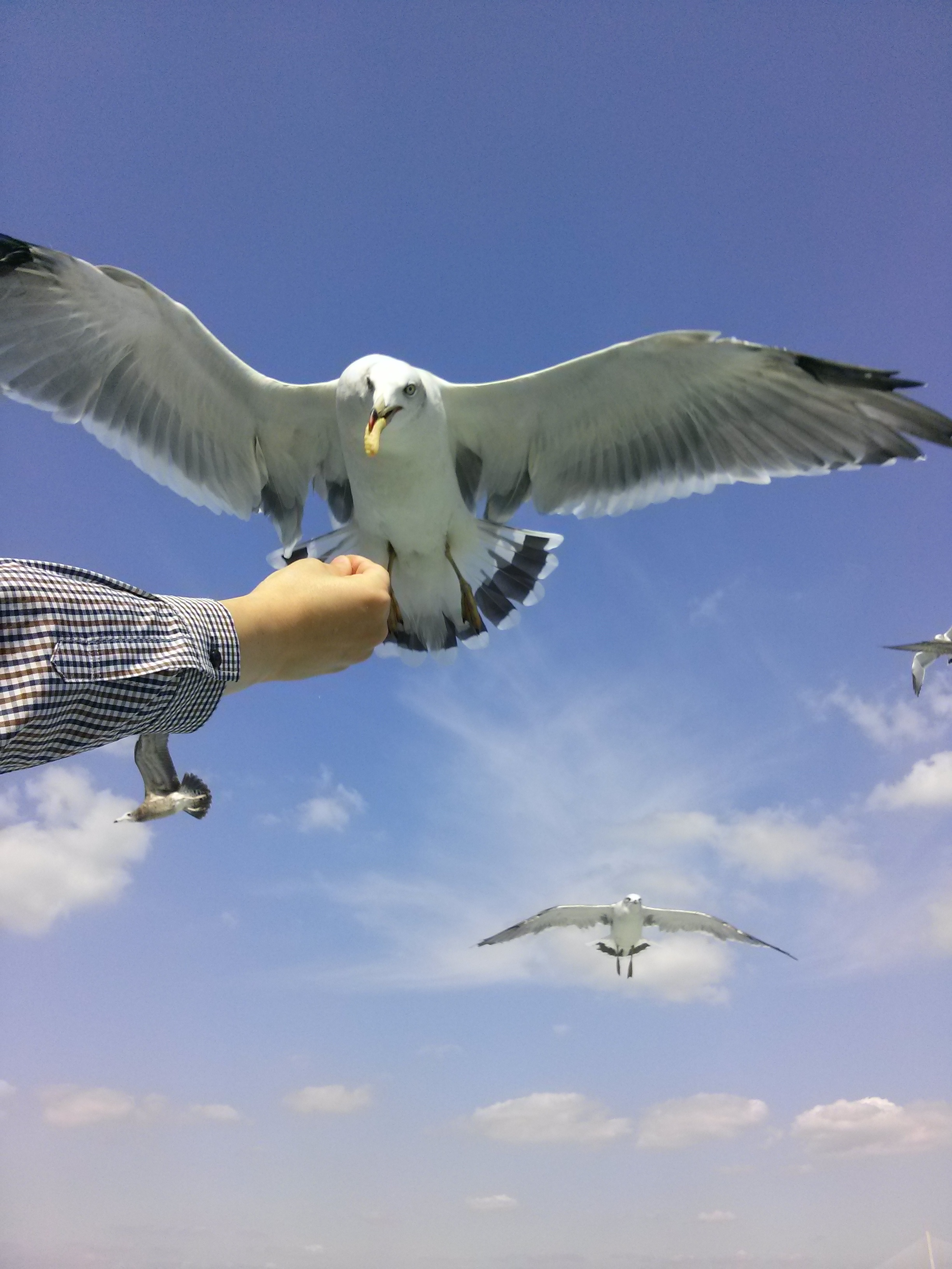 이미 수많은 갈매기가 새우깡 맛을 보았는 지 새우깡을 보고 쏜살같이 날라온다.